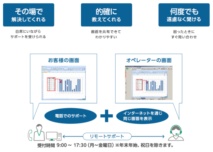 口頭では伝わりにくい操作方法も「指差し機能」と「赤ペン機能」で明確にわかります。キーボード入力画面も表示可能なので、キーの位置が分からないときも的確にサポート。オペレーターで遠隔操作を行う場合は、確認画面よりお客様の同意をいただくので安心です。