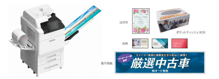 幅広い用紙サイズ・紙厚に対応し、多彩な成果物を作成できます。チラシや名刺、ポスターも⼿軽に作成でき、ビジネスが広がります。